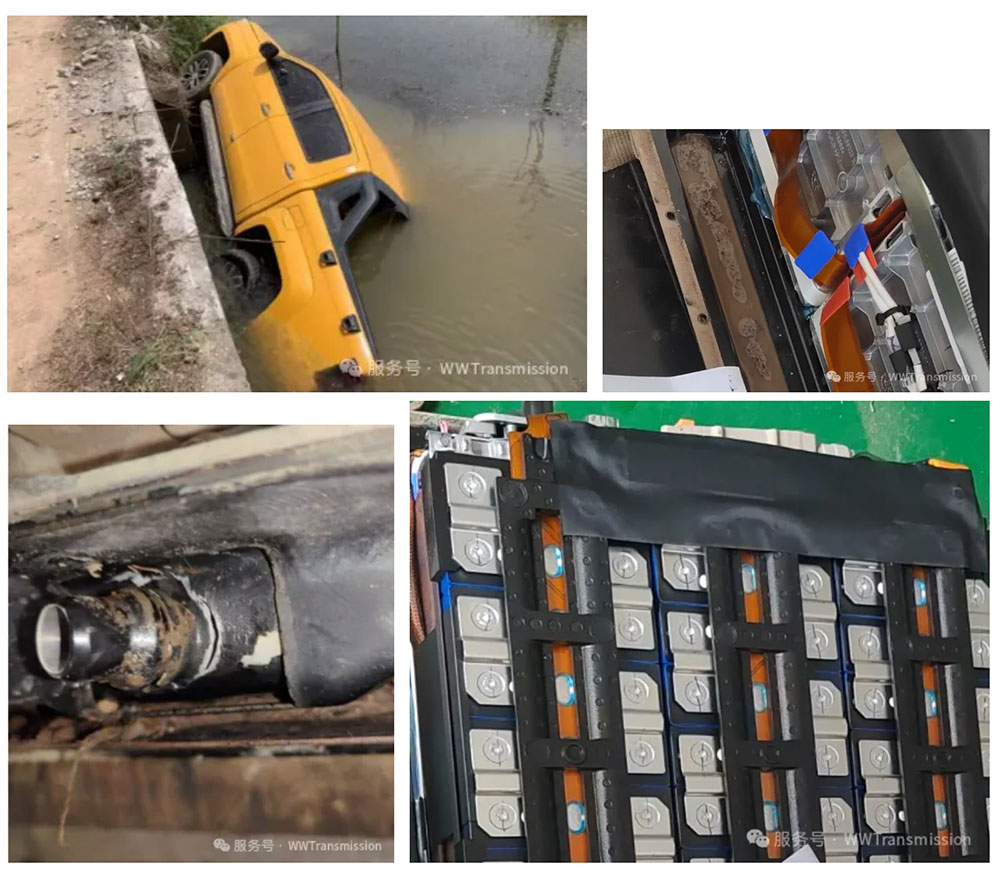 江铃域虎车辆在意外情况下驶入鱼塘,导致电池包内部进水,同时冷却管接头出现变形与开裂。