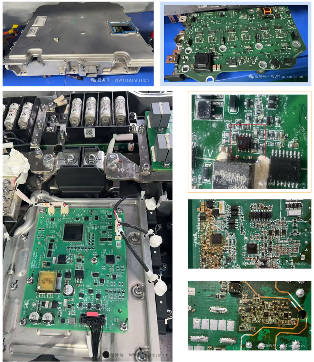 拆检电机控制器,发现一芯片严重烧蚀。该芯片用于驱动变压器,为IGBT提供栅极电压。芯片损坏导致IGBT无法导通,系统触发保护。此电路仅在挂挡时启动,与故障现象一致。