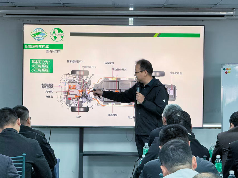 培训依托花都全球新能源技术培训中心完善的硬件设施,构建了“理论教室+实训车间+模拟现场”三位一体的教学环境。现场配备了3台新能源实车、2套拆解式电池包模型及多种专业实操设备,助力学员完成从零部件认知到事故处置全流程的实操训练,有效强化了教学实效。
